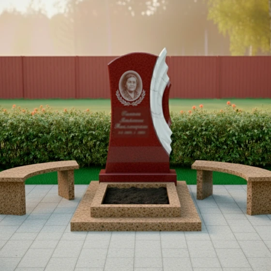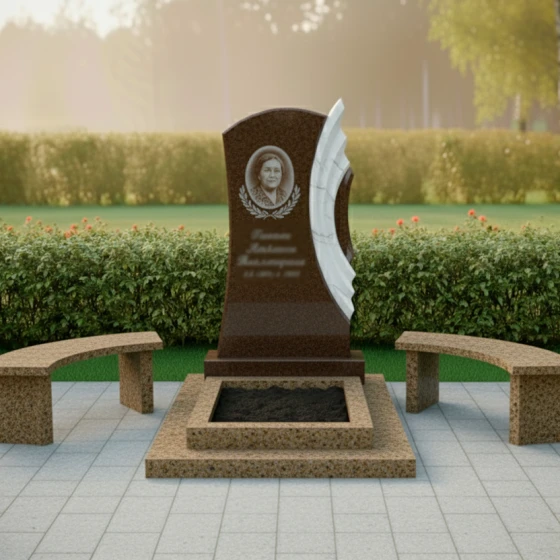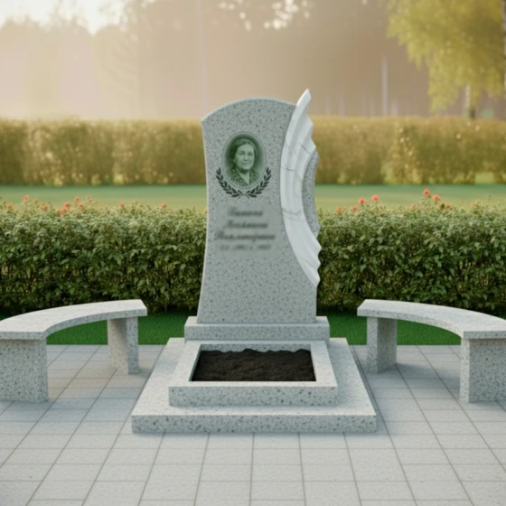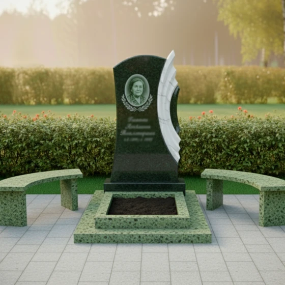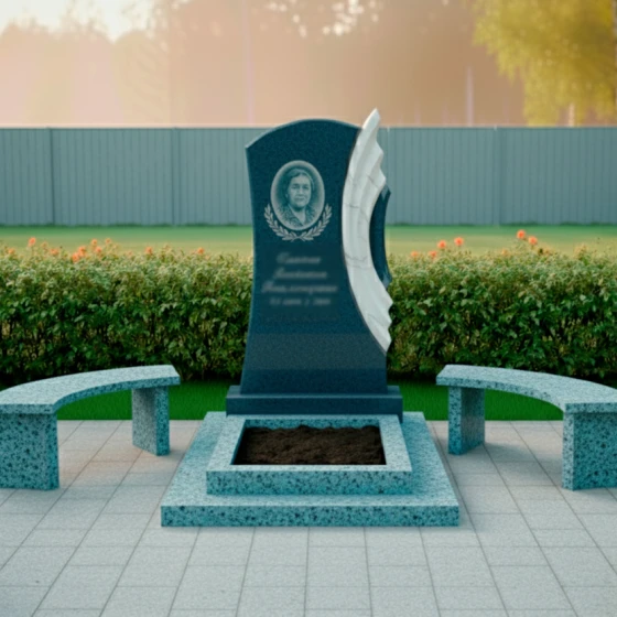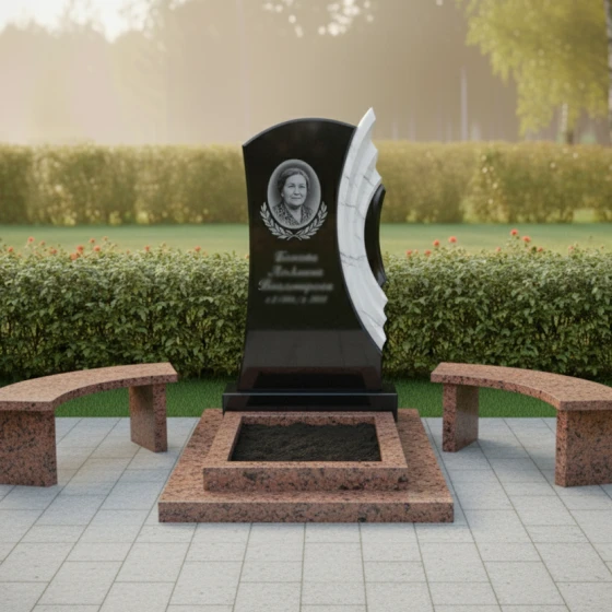 Благоустройство участка вокруг монумента выполнено с таким же вниманием к деталям. Монумент установлен на многоуровневый гранитный цоколь, который не только обеспечивает исключительную устойчивость всей конструкции, но и придает ей завершенный, величественный вид. Нижний уровень цоколя имеет широкую, прочную основу, на которой возвышаются два дополнительных уровня, создавая эффект пьедестала. В центре цоколя расположено аккуратное прямоугольное углубление, предназначенное для цветочной клумбы или установки вазы, что позволяет добавить живые краски и персонализировать место памяти. По бокам от центрального цоколя расположены две изящные гранитные скамейки с плавно изогнутыми сиденьями, выполненные из того же камня, что и цоколь. Эти скамейки приглашают к уединенному размышлению и спокойному созерцанию, создавая комфортное пространство для тех, кто пришел почтить память. Вся площадь вокруг памятника выложена светлой тротуарной плиткой, что обеспечивает чистоту, порядок и удобство в уходе за местом упокоения.