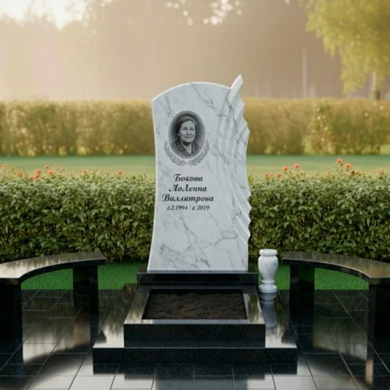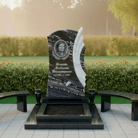 Величественная стела, представленная на изображении, является центральным элементом композиции. Ее форма представляет собой гармоничное сочетание строгих линий и мягких изгибов. Основная часть стелы имеет классическую прямоугольную форму с элегантным арочным завершением в верхней части, что придает ей монументальность и ощущение надежности. С правой стороны стелы расположен уникальный резной элемент, напоминающий развевающийся по ветру парус или крыло. Этот элемент выполнен из светлого камня с матовой, слегка шероховатой фактурой, что создает поразительный контраст с зеркальной, глубоко полированной поверхностью основной черной стелы. Игра света и тени на этих контрастных фактурах придает композиции динамизм и объем, заставляя камень "оживать" под разными углами обзора. Именно этот контраст, где матовый срез камня на резных элементах встречается с глубокой зеркальной полировкой, создает неповторимый художественный эффект, подчеркивая мастерство исполнения и утонченность дизайна.