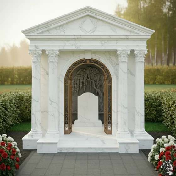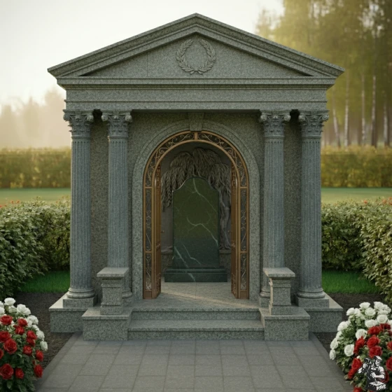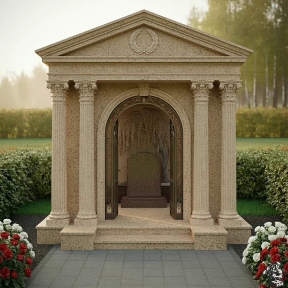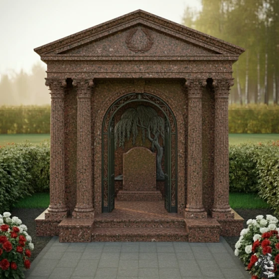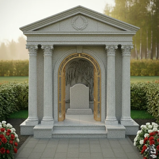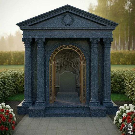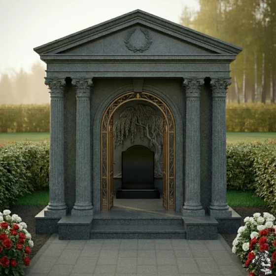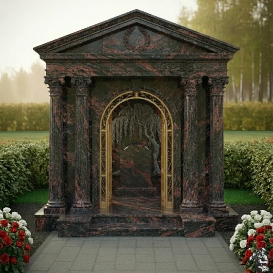 Величественная стела ПН 046 представляет собой выдающийся образец мемориальной архитектуры, в которой классические формы гармонично сочетаются с глубоким символизмом. Центральным элементом композиции является изящная арка, обрамлённая двумя парами мощных дорических колонн с канелюрами, которые придают конструкции античную стать и монументальность. Каждая колонна покоится на массивном квадратном основании и увенчана капителью, выполненной с тонкой детализацией, что подчёркивает классический стиль. Над аркой возвышается фронтон, украшенный рельефным лавровым венком — древним символом славы, победы и вечной памяти. Внутренняя часть арки оформлена барельефом, изображающим плакучую иву – символ скорби и вечной печали, но также и возрождения, её ветви спускаются, создавая ощущение умиротворения и защиты. Элементы резьбы выполнены с поразительной точностью: каждый лист и ветвь ивы имеют объём, создавая игру света и тени. Зеркальная полировка чёрного камня стелы контрастирует с матовыми, более светлыми срезами на резных элементах, что придаёт композиции глубину и выразительность. Внутренняя часть арки дополнена изящной кованой решёткой золотистого цвета с ажурными узорами, напоминающими о вратах в иной мир, при этом она создаёт ощущение уюта и защищенности.