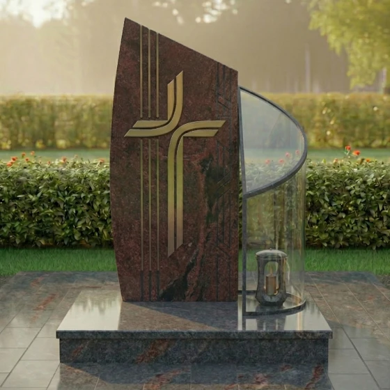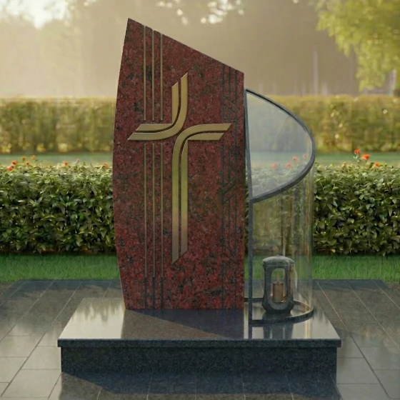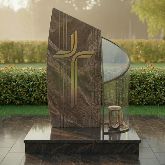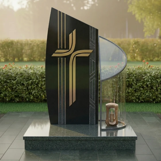 Главным акцентом, вырезанным на поверхности стелы, является стилизованный христианский крест. Он выполнен в современном, лаконичном дизайне, где перекладины нежно сливаются с вертикальной осью, образуя единое, утонченное целое. Золотистое покрытие креста контрастирует с темной, глубокой полировкой основного камня, создавая выразительный акцент, наполненный символическим значением веры и надежды. Справа от креста, на второй плоскости стелы, прослеживается еле заметная, но изящная резьба в виде геометрических линий, напоминающих лучи или абстрактные символы. Эта тонкая работа добавляет композиции изысканности и подчеркивает внимание к деталям.