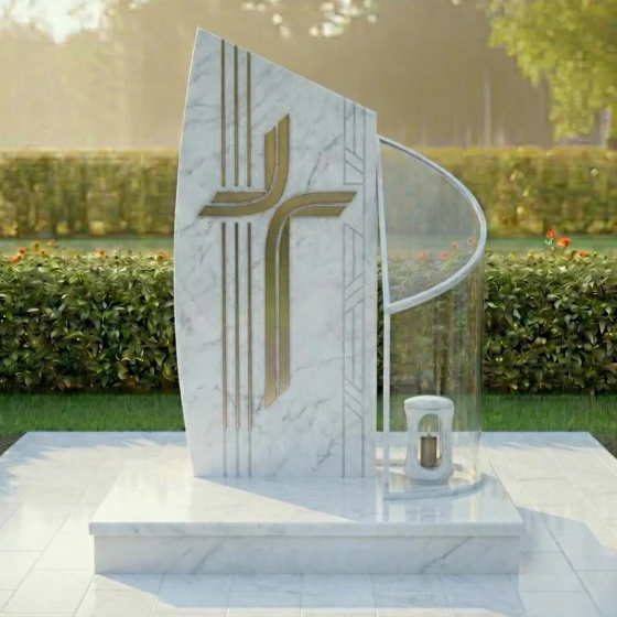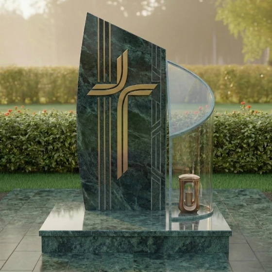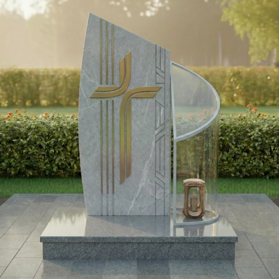 Форма стелы представляет собой смелое архитектурное решение: две асимметричные плоскости, одна из которых имеет плавный, слегка изогнутый абрис, а вторая — строгий, прямолинейный срез, создают ощущение движения и устремленности ввысь. Их соединение под углом формирует уникальный профиль, напоминающий раскрытую книгу или крыло, символизирующее переход души в иное измерение. Грани стелы безупречно отполированы до зеркального блеска, что позволяет камню играть со светом, отражая его и создавая эффектную игру теней. Эта игра света и тени придает монументу невероятный объем и глубину, подчеркивая каждую линию и изгиб.