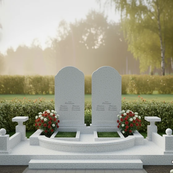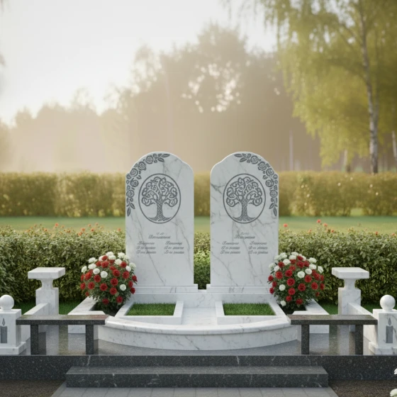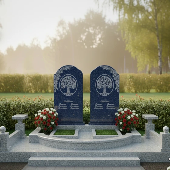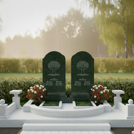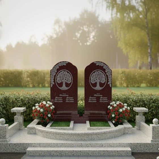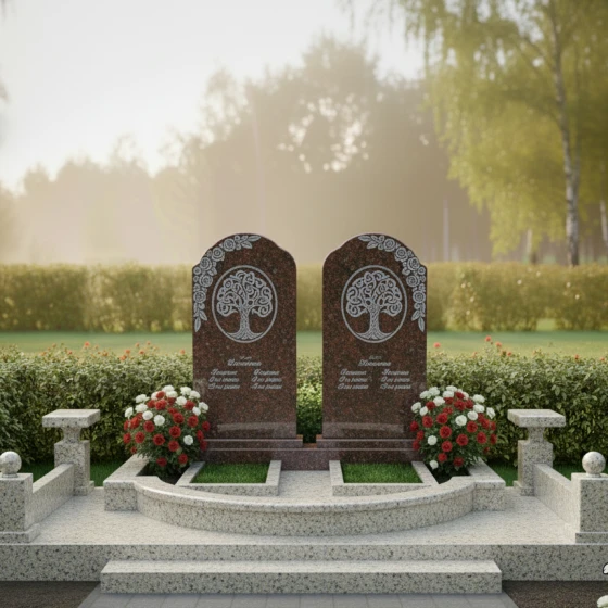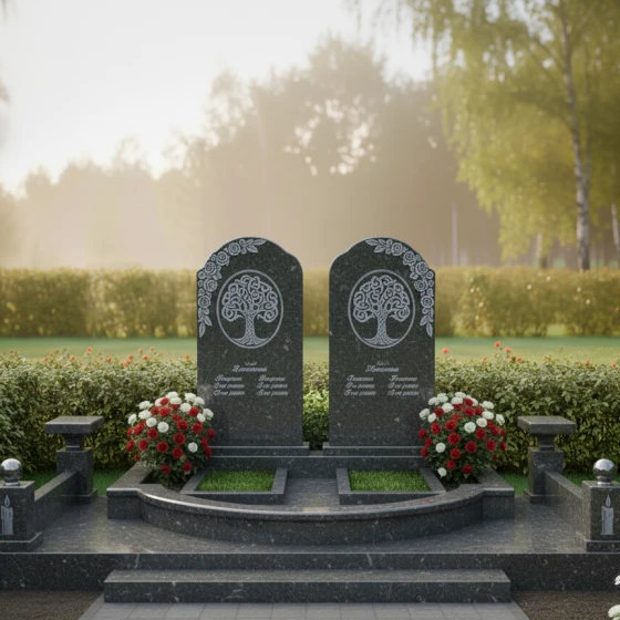 Гранитный монумент (Артикул: ПН 053) представляет собой глубоко символичную и величественную композицию, созданную для увековечивания светлой памяти о двух близких людях. Две вертикальные мемориальные плиты, выполненные в классическом арочном дизайне с плавными верхними изгибами, напоминающими купола, стоят рядом, символизируя неразрывную связь и единство душ. Каждая плита в верхней части украшена изящной гравировкой "Древа Жизни" — символа бессмертия, цикличности бытия и вечной памяти, корни которого уходят в прошлое, а ветви стремятся в бесконечность. Детализация гравировки поражает: тонкие ветви переплетаются, создавая ажурный узор, который выделяется на фоне зеркальной полировки камня, словно светлая надежда на темном полотне вечности. Строгие, но при этом мягкие грани каждой плиты обработаны до совершенства, создавая ощущение надежности и покоя.