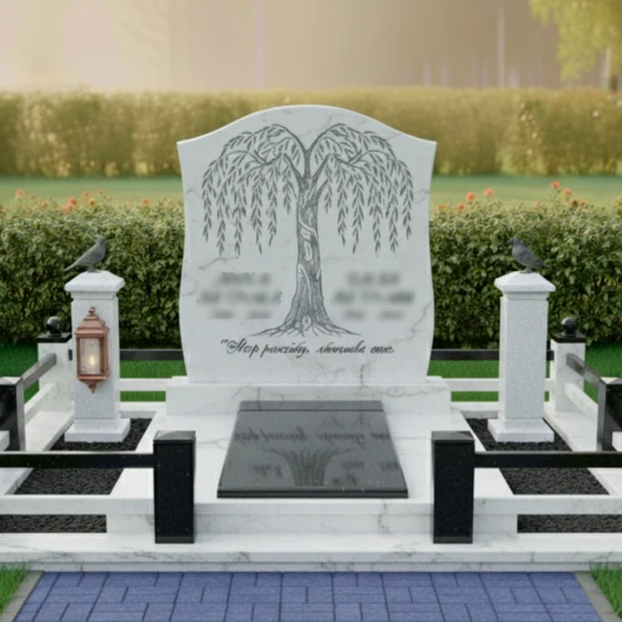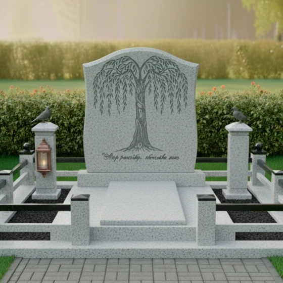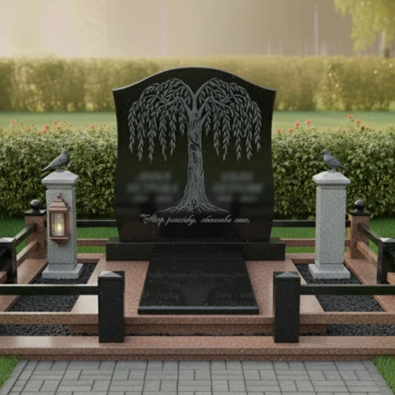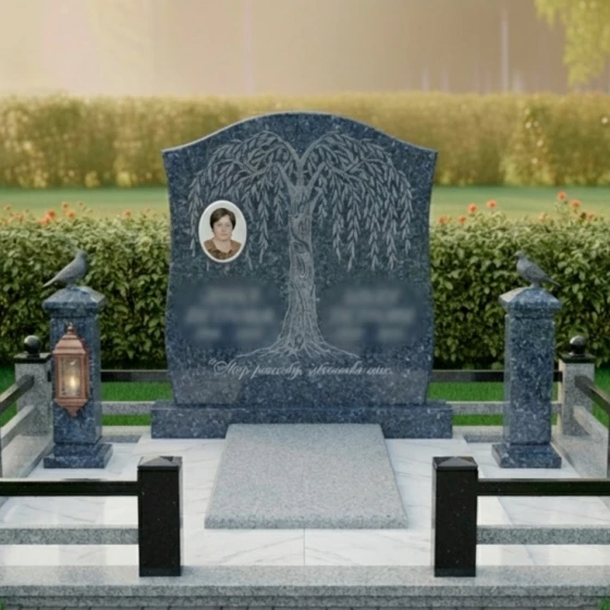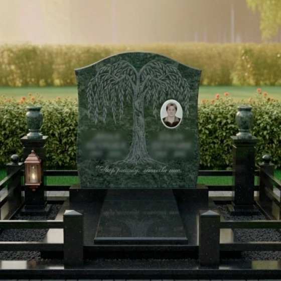 Особое внимание в этой модели уделено возможности персонализации. Гранитный монумент (Артикул: ПН 060) доступен в восьми великолепных цветовых решениях, что позволяет подобрать камень, который наилучшим образом отразит характер и индивидуальность усопшего. Среди них: семь видов гранита – глубокий амфиболит, благородный Балтик грин, таинственный Блю Перл, классический Габбро-диабаз, теплый Дымовский, величественный Лезниковский и светлый Мансуровский, а также изысканный мрамор Тассо. Каждый из этих камней обладает своим уникальным рисунком и оттенком, что делает каждый монумент поистине неповторимым. На гладкой, полированной поверхности плиты идеально будет смотреться портрет, выполненный методом гравировки или фотокерамики. Благодаря выбранной форме памятника, для портрета остается достаточно места, чтобы разместить его гармонично, не нарушая общую композицию с плакучим деревом. Возможно также нанесение эпитафии, которая будет прекрасно читаться на фоне полированного камня. Весь участок благоустроен с особым вниманием к деталям. Монумент установлен на основательный гранитный цоколь, который придает всей конструкции дополнительную массивность и устойчивость, создавая четкие границы мемориального комплекса. По периметру участка расположен низкий, но прочный каменный бордюр, выполненный в едином стиле с основным монументом, который не только эстетически завершает композицию, но и упрощает уход за местом захоронения. Надгробная плита, выполненная из того же материала, что и основной памятник, создает единое, законченное пространство, исключающее необходимость в регулярной прополке и уходе за почвой. По углам цоколя возвышаются массивные каменные столбики, увенчанные сферическими навершиями, которые придают композиции торжественность и завершенность. С одной стороны, на столбике размещен элегантный фонарь-лампадка, выполненный из металла со стеклянными вставками, который символизирует негасимый свет памяти. С другой стороны, на аналогичном столбике, восседает фигурка птицы, возможно, голубя или ворона, добавляя композиции философского смысла и утонченности. Это комплексное решение для благоустройства, где каждая деталь гармонично дополняет друг друга, создавая место вечного покоя, достойное памяти.