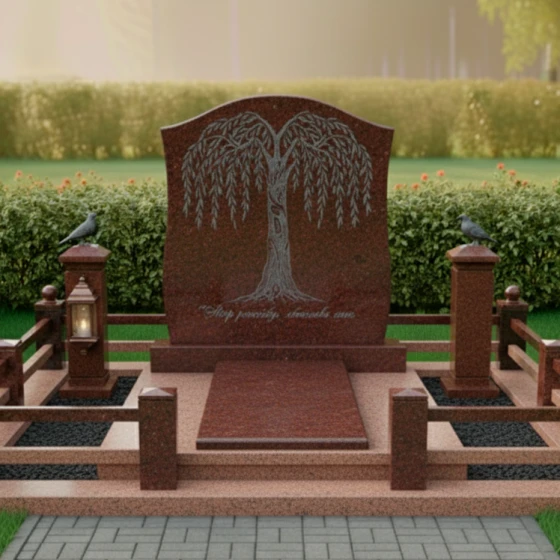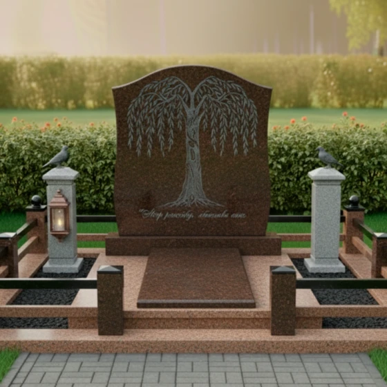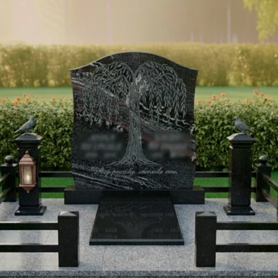 Гранитный монумент (Артикул: ПН 060) — это воплощение изящества и глубокого смысла, застывшего в камне. Каждая деталь здесь продумана до мелочей, чтобы создать не просто надгробие, а настоящий мемориал, хранящий светлую память о близком человеке. Центральным элементом композиции является изысканная вертикальная плита, чьи верхние грани обработаны в форме плавной, ниспадающей арки, напоминающей свод или, возможно, склоненные в скорби ветви ивы. Это не строгий прямоугольник, а мягкий, обтекаемый силуэт, который придает всей конструкции особую выразительность и утонченность. Лицевая сторона монумента имеет глубокую зеркальную полировку, что позволяет камню отражать свет и создавать эффект глубины, подчеркивая монументальность и благородство материала. На этом глянцевом фоне мастерски выполнена гравировка в виде раскидистого дерева с плакучими ветвями. Каждая тончайшая веточка, каждый изгиб листа прорисован с невероятной детализацией, создавая ощущение живого, трепетного образа, символизирующего жизнь, продолжение рода и вечную скорбь. Корни дерева, уходящие в основание плиты, символизируют глубокую связь с землей и памятью. Тонкий, матовый срез по периметру плиты создает деликатный контраст с полированной поверхностью, добавляя изделию объема и подчеркивая безупречность форм. Это не просто камень, это произведение искусства, созданное с душой и глубоким уважением к памяти.