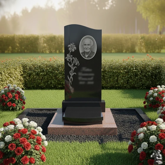 На зеркально-полированной поверхности стелы, которая отражает свет и окружающий мир, создавая эффект глубины, расположено овальное изображение портрета, выполненное в технике гравировки. Рядом с ним, словно живые, расцветают изящные лилии, их тонкие стебли и распустившиеся бутоны гравированы с потрясающей детализацией. Каждый лепесток, каждая тычинка прорисованы с ювелирной точностью, создавая ощущение легкости и нежности, символизируя чистоту души и вечную красоту. Контраст между глубокой черной полировкой камня и светлым, матовым изображением гравировки придает композиции особую выразительность и объем, заставляя каждый элемент выделяться и притягивать взгляд.