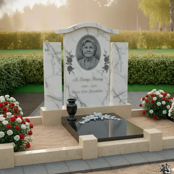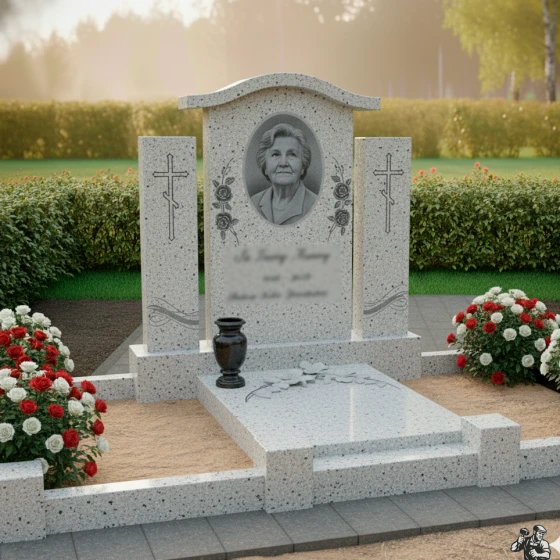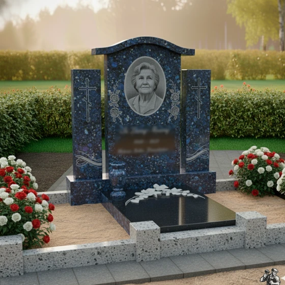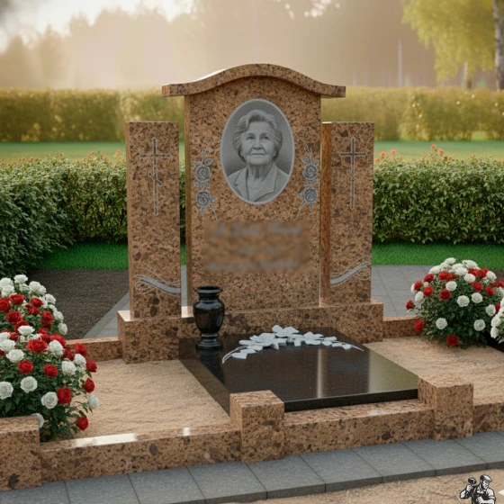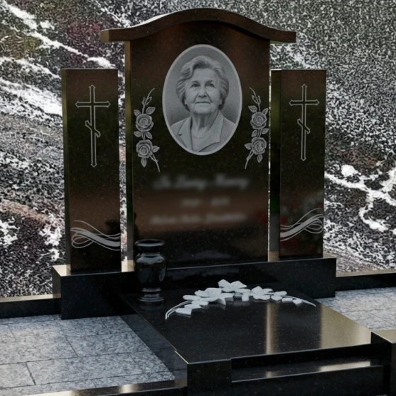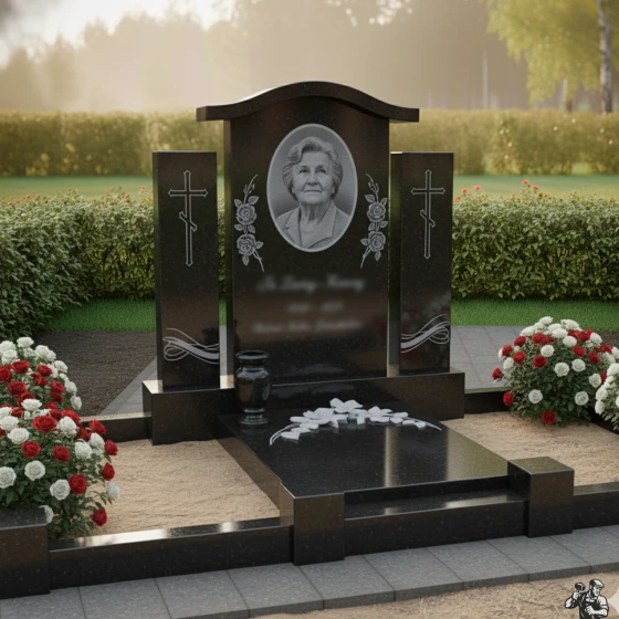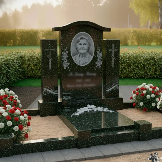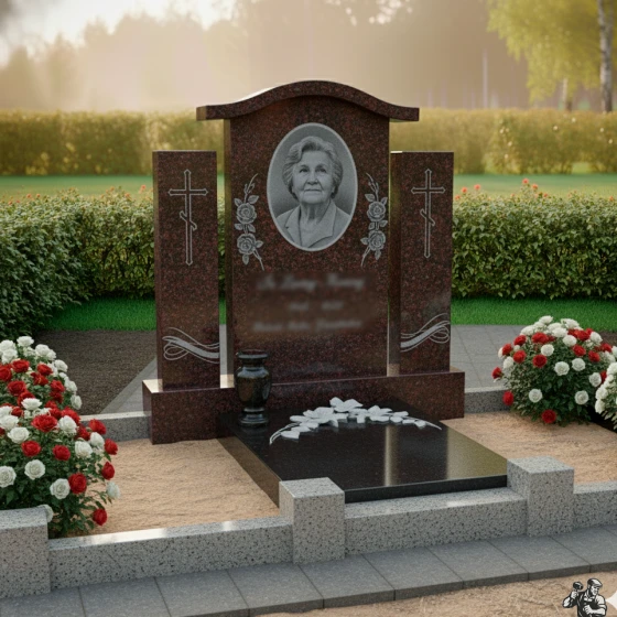 Величественная стела модели ПН 076 представляет собой гармоничное сочетание классических форм и утонченных декоративных элементов. Центральная часть стелы имеет изысканную арочную форму с плавным, волнообразным изгибом верхней грани, что символизирует бесконечность жизненного пути и обретение вечного покоя. Фронтальная поверхность, выполненная в глубокой зеркальной полировке, идеально отражает свет, создавая ощущение глубины и торжественности. В центре стелы расположено овальное поле для портрета, обрамленное нежным венком из распустившихся роз с проработанными до мельчайших деталей лепестками и стеблями, что придает изображению особую выразительность и объем. Ниже портрета предусмотрено место для эпитафии и дат жизни, выполненное с той же элегантной гравировкой, которая подчеркивает значимость каждой детали.