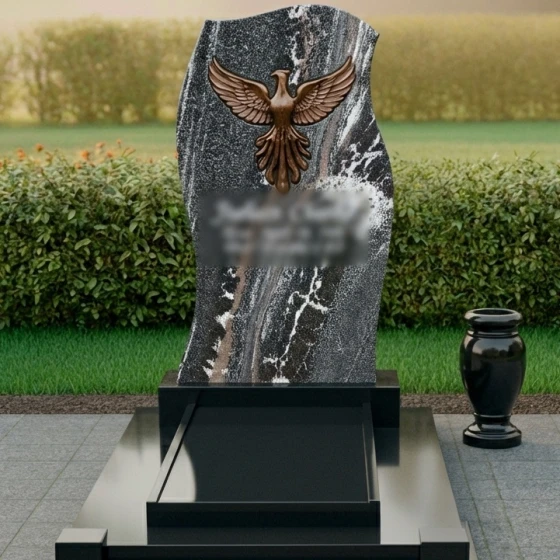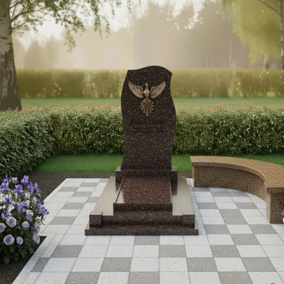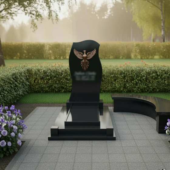 Центральный элемент этой мемориальной композиции – изящно изогнутая стела, напоминающая языки пламени или распахнутые крылья. Её верхняя часть имеет асимметричную, но гармоничную волнистую форму, которая словно стремится ввысь, символизируя возрождение и духовное восхождение. Боковые грани стелы искусно отполированы до зеркального блеска, создавая глубокий контраст с матовыми, слегка шероховатыми торцами, что подчеркивает естественную красоту и структуру камня. Фаски на гранях выполнены с ювелирной точностью, придавая изделию завершённость и благородство. Венчающий композицию барельеф феникса, с его детально проработанными перьями и мощными крыльями, является ключевым акцентом, выполненным в бронзовом или золотистом оттенке, что выделяет его на фоне темного камня и придает ему особый, почти мистический вид. Нижняя часть стелы плавно переходит в многоступенчатое основание, каждая ступень которого также тщательно отполирована, создавая эффект пьедестала и придавая всей конструкции дополнительную массивность и устойчивость. Это многоярусное основание не только эстетически привлекательно, но и функционально, обеспечивая прочное и надежное крепление для стелы.