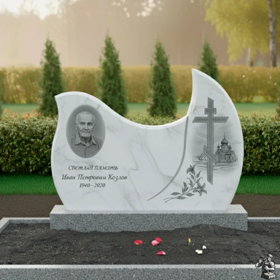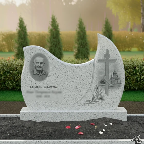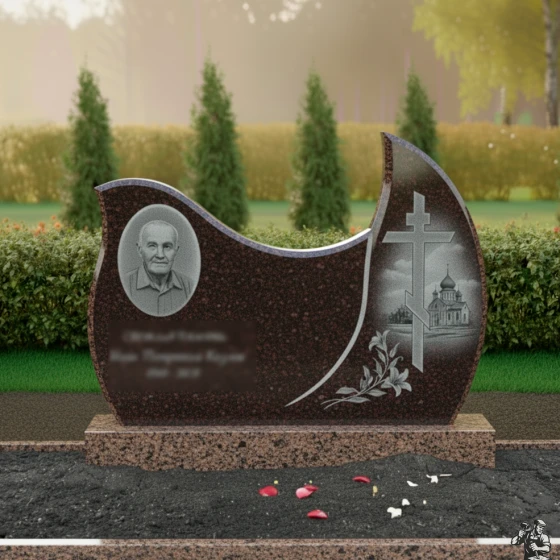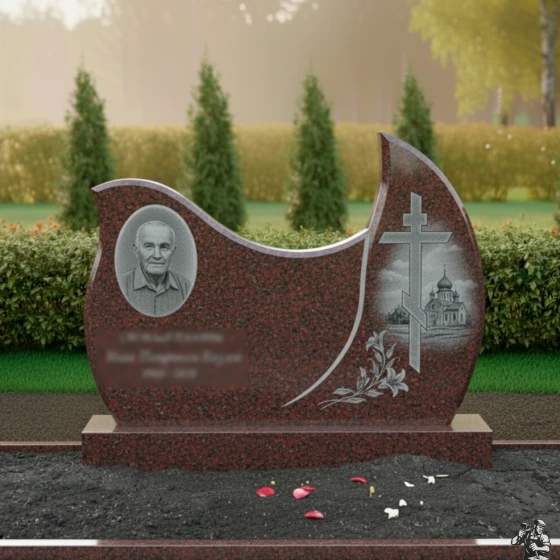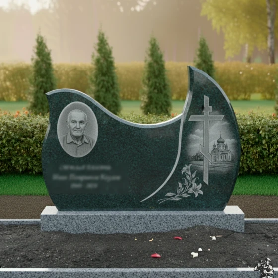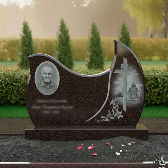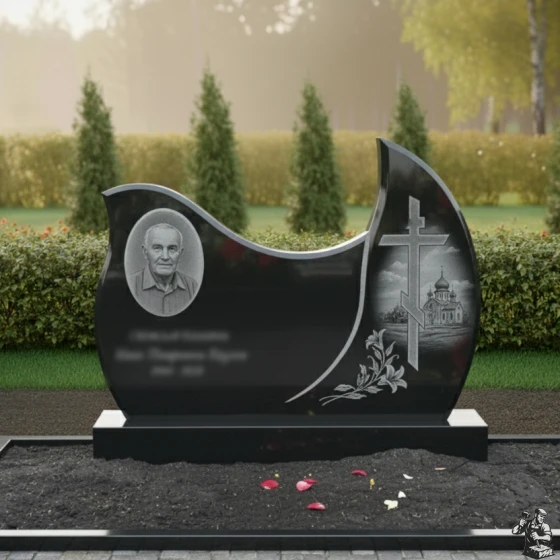 Оформление: Для стелы такой формы, с овальным полем для портрета, рекомендуется выбирать гравировку, которая подчеркнет плавность линий и общую гармонию композиции. Портрет лучше всего размещать в левой, более округлой части стелы, где он будет выглядеть наиболее естественно и выразительно. ФИО и даты жизни следует гравировать ниже портрета, используя классические шрифты, которые легко читаются и не отвлекают внимание от образа усопшего. Желательно использовать контрастный метод гравировки, чтобы текст и портрет выделялись на фоне полированного камня, обеспечивая максимальную четкость и долговечность изображения. Благодаря своей массивности и строгости, эта модель идеально подходит для создания мемориала, который будет символизировать незыблемость памяти и вечное уважение.