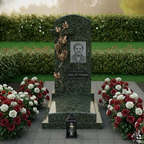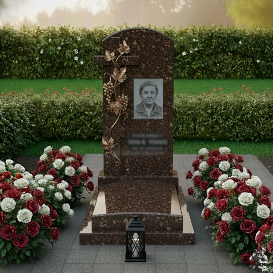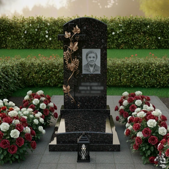 Гранитный монумент установлен на прочный, многоуровневый цоколь, который придает всей конструкции внушительность и устойчивость. Цоколь, выполненный из того же темного гранита, что и основное надгробие, имеет несколько ступеней, создающих эффект пьедестала и возвышающих центральный элемент. По периметру участка расположен массивный каменный бордюр, который четко очерчивает границы захоронения и придает ему завершенный, ухоженный вид. Вся надгробная плита выложена сплошным гранитным настилом, что не только создает эстетически гармоничный ансамбль, но и значительно упрощает уход за местом упокоения, предотвращая рост сорняков и сохраняя идеальный порядок на долгие годы. В передней части комплекса, у основания надгробия, располагается стильная каменная лампадка, выполненная в виде миниатюрного фонаря. Её строгие линии и темный оттенок идеально вписываются в общую концепцию, добавляя нотку торжественности и символизируя неугасающий свет памяти.