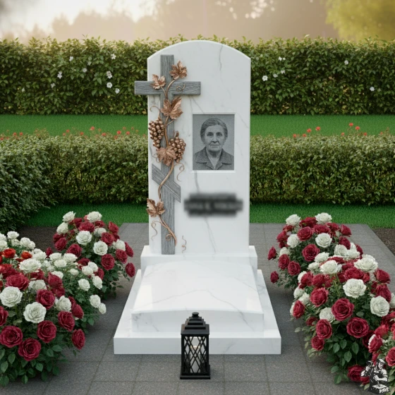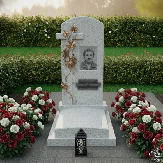 Особое внимание привлекает резной декоративный элемент — православный крест, обвитый виноградной лозой с гроздьями винограда и листьями. Этот элемент выполнен из камня, но благодаря искусной резьбе и контрасту фактур (матовая, словно состаренная поверхность креста и лозы против глянцевой основы) он кажется объемным и почти живым. Виноградная лоза, символизирующая жизненный путь и плодородие, элегантно переплетается вокруг креста, создавая ощущение гармонии и непрерывности бытия. Детализация резьбы поражает — каждый лист, каждая ягода винограда проработаны с ювелирной точностью, придавая композиции особую выразительность и глубину.