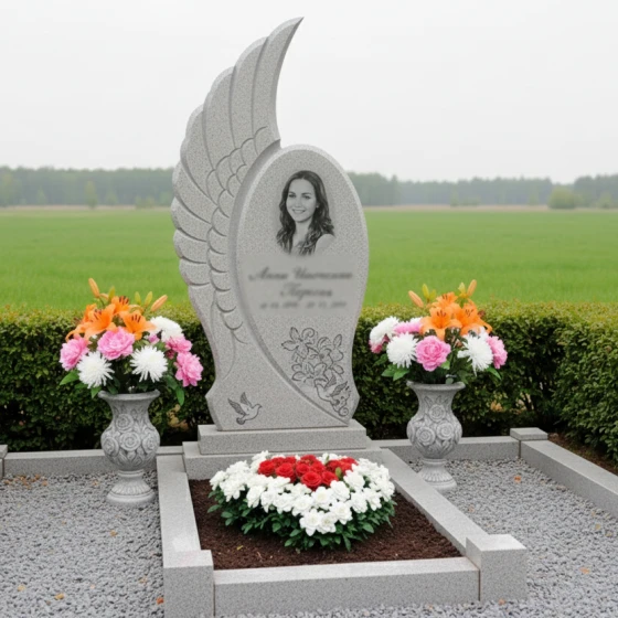 Кому подойдет: Этот мемориальный комплекс идеально подойдет для тех, кто ищет не просто памятник, а уникальное произведение искусства, способное глубоко и трогательно выразить светлую память о близком человеке. Его плавные, обтекаемые формы и символика крыла делают его особенно подходящим для увековечивания памяти о женщинах, чья жизнь была наполнена нежностью, грацией и духовностью. Мемориал станет достойным символом вечного покоя и возвышенной памяти, отражая индивидуальность и значимость ушедшего. Возможность выбора из 8 цветовых решений — 7 видов гранита (гранит амфиболит, гранит Балтик грин, гранит Блю Перл, гранит Габбро-диабаз, гранит Дымовский, гранит Лезниковский, гранит Мансуровский) и 1 вид мрамора (мрамор Тассо) — позволяет подобрать камень, который наиболее точно соответствует характеру и предпочтениям усопшего, создавая по-настоящему персонализированный и глубоко символичный мемориал.