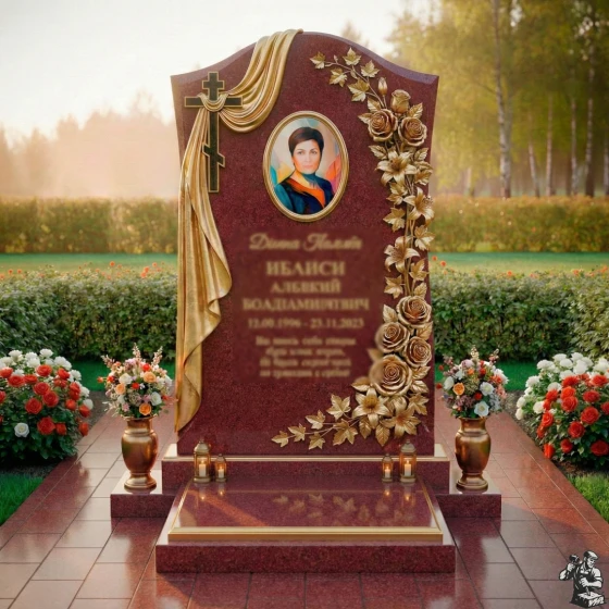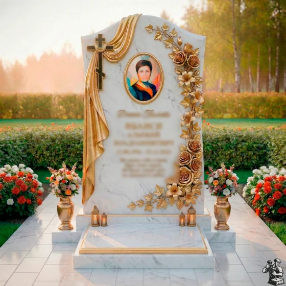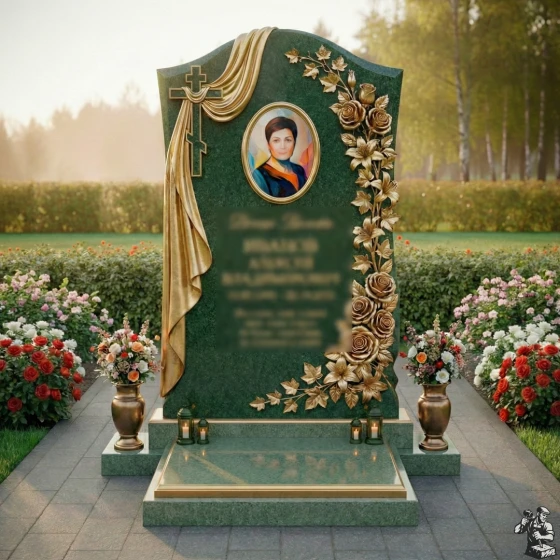 Центральное место на стеле занимает элегантный овальный медальон для портрета, обрамленный тонкими, но выразительными золотыми линиями, которые придают ему особую торжественность. Слева от портрета ниспадает объемная драпировка из камня, искусно имитирующая мягкие складки ткани, что символизирует покой и вечный сон. В верхней части драпировки расположен лаконичный православный крест, выполненный в строгом, но выразительном стиле, подчеркивающий духовное значение мемориала. Правая сторона стелы украшена пышной резной композицией из роз и вьющихся листьев, выполненных с невероятной детализацией. Каждая роза, каждый лепесток вырезан с филигранной точностью, создавая ощущение живого букета. Контраст между черной полированной поверхностью камня и светлыми, матовыми срезами резных элементов придает композиции объем и выразительность, подчеркивая красоту и хрупкость цветов. Эта модель доступна в 8 различных цветовых решениях, что позволяет подобрать камень, который наилучшим образом отразит индивидуальность и характер усопшего. Среди них: глубокий и насыщенный гранит амфиболит, благородный Балтик грин, уникальный Блю Перл, классический Габбро-диабаз, теплый Дымовский, величественный Лезниковский, светлый Мансуровский и изысканный мрамор Тассо. Каждый из этих материалов обладает своей неповторимой фактурой и оттенком, что позволяет создать по-настоящему уникальный и персонализированный мемориал, достойный светлой памяти. Выбор камня становится важным шагом в создании образа, который будет гармонировать с воспоминаниями о человеке, сохраняя его уникальность на века.