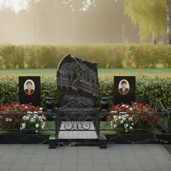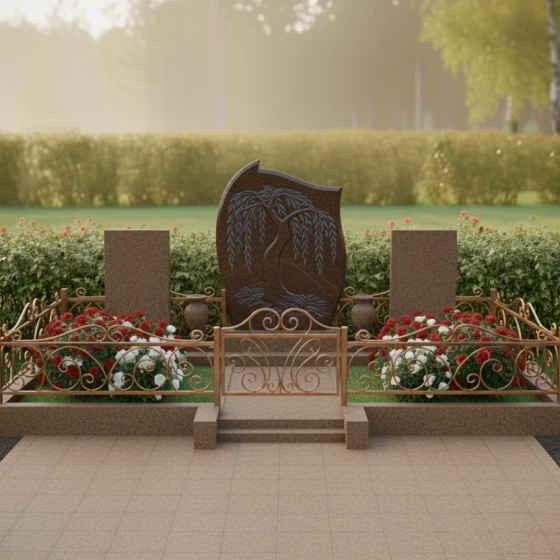 Кому подойдет: Это архитектурное решение идеально для оформления родового или семейного захоронения на трех человек. Благодаря сочетанию плавных изгибов центральной стелы и строгих линий боковых элементов, монумент выглядит универсально — он одинаково уместен как для выражения скорби по женщине (через мягкие формы и символику ивы), так и для почитания памяти мужчин, чья жизнь была опорой семьи. Мемориальная композиция станет достойным символом преемственности поколений и вечной памяти, воплощенной в благородном камне.