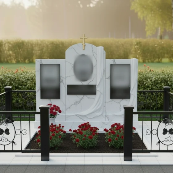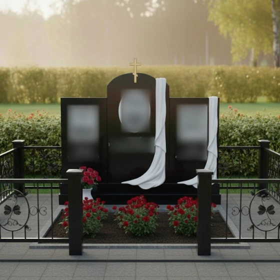 В основе ансамбля лежит классический триптих, состоящий из доминирующей центральной стелы с изящным арочным завершением и двух симметричных боковых крыльев строгой прямоугольной формы. Главным акцентом, приковывающим взгляд, является искусно выполненная художественная драпировка — белоснежная плащаница. Резчики по камню с филигранной точностью передали мягкость ниспадающей ткани, её глубокие складки и естественный объем, который создает поразительный контраст с идеально гладкой, зеркальной полировкой основного монумента.