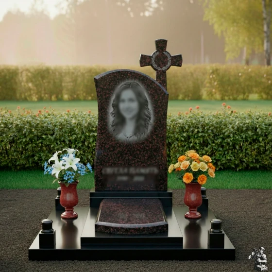 - Комплектация: Стела, постамент, сплошная надгробная плита, система декоративных столбиков, две вазы из аналогичного материала.