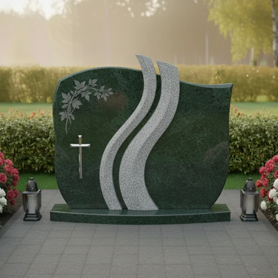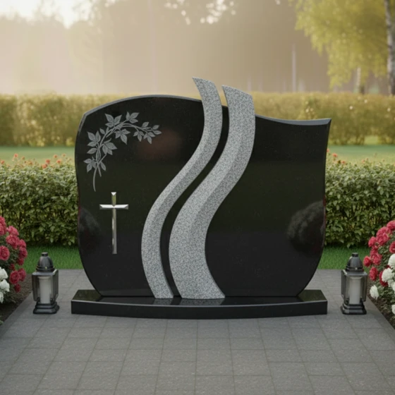 Величественная стела ПН 701 представляет собой уникальное сочетание классической элегантности и современной динамики. Основа стелы – это массивная плита из глубокого черного гранита, чья идеально отполированная поверхность отражает мир вокруг, словно зеркало, символизируя чистоту души и бесконечность памяти. Верхняя часть стелы имеет плавный, волнообразный изгиб, который придает ей ощущение легкости и устремленности вверх, словно душа, возносящаяся к небесам. Этот изгиб не просто декоративный элемент; он создан с филигранной точностью, демонстрируя виртуозность работы с камнем. Боковые грани стелы также тщательно обработаны, повторяя общий волнообразный контур, что создает гармоничный и завершенный образ. На левой стороне стелы, на фоне глубокого черного гранита, искусно выгравирована ветвь с нежными листьями, выполненная в технике матовой гравировки. Ее светлый, почти серебристый оттенок контрастирует с зеркальной поверхностью камня, придавая изображению объем и реалистичность. Ниже ветви расположен лаконичный православный крест, также выполненный методом гравировки, его строгие линии подчеркивают духовную составляющую монумента. Центральным элементом композиции являются две вертикальные, изогнутые ленты, выполненные из светлого, мелкозернистого гранита. Эти ленты, словно два потока, переплетаются и устремляются вверх, символизируя неразрывную связь между мирами и вечное движение жизни и памяти. Их матовая, слегка шероховатая фактура создает интересный тактильный и визуальный контраст с полированной черной стелой, подчеркивая глубину и многогранность композиции.