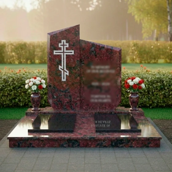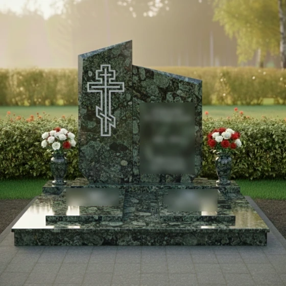 Центральным элементом композиции является величественная стела, состоящая из двух вертикальных сегментов разной высоты, объединенных в единый ансамбль. Верхняя грань мемориала имеет сложную асимметричную геометрию: резкие, динамичные скосы устремлены ввысь, что создает визуальный эффект восхождения. Грани стелы обработаны широкой фаской, которая подчеркивает массивность натурального камня и придает объекту дополнительный объем. Особое внимание уделено художественному оформлению: на левой, более высокой части плиты, вырезан православный крест. Его исполнение отличается лаконичностью — четкий двойной контур подчеркивает строгость веры, не перегружая композицию лишними деталями. Зеркальная полировка основной поверхности контрастирует с матовым внутренним срезом креста, создавая благородную игру света и тени, заметную при любом ракурсе.