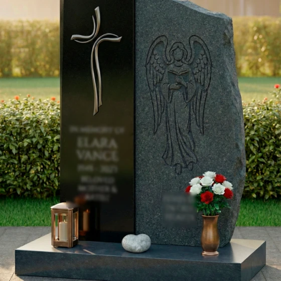Представленное ритуальное изделие под артикулом 719 — это сложный художественный ансамбль, в котором мастерство камнереза достигает уровня высокого искусства. Композиция построена на выразительном диалоге двух стихий: безупречной, зеркальной полировки и первозданной, суровой фактуры «скалы». Левая часть стелы представляет собой строгий вертикальный блок с мягко скругленным верхним гребнем, чья глубокая темная поверхность служит идеальным фоном для изящного накладного креста. Крест выполнен в современном стиле: его плавные, переплетающиеся линии лишены тяжести, они словно парят в воздухе, символизируя динамику духа и торжество жизни над забвением.
