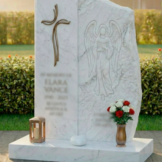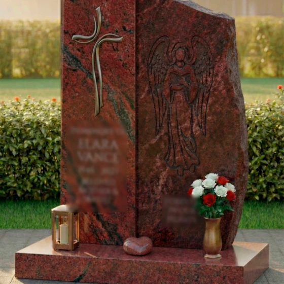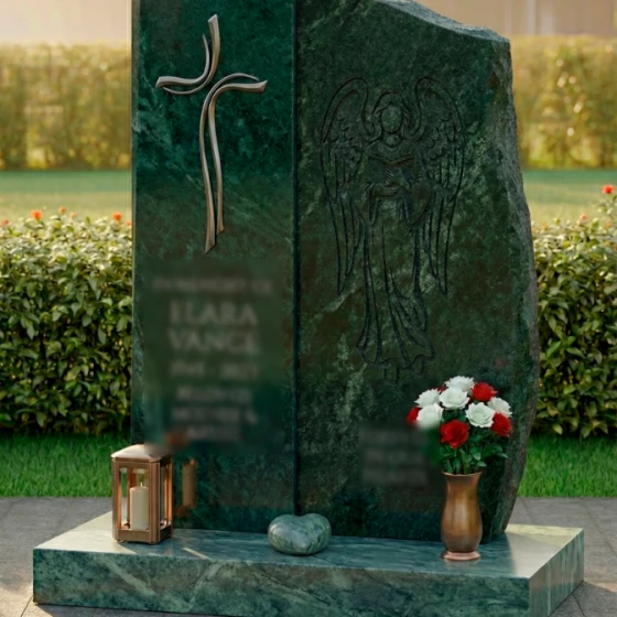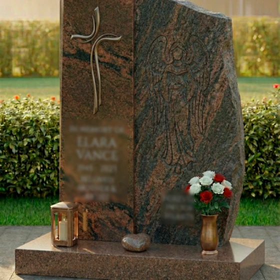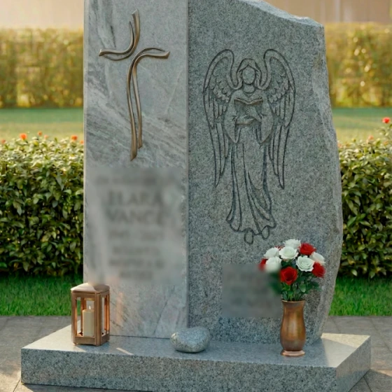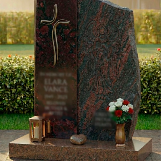Оформление: Учитывая насыщенную художественную резьбу в правой части стелы, портрет и основные надписи рекомендуется размещать на левом полированном блоке под крестом. Глубокая гравировка ФИО с последующим покрытием сусальным золотом или «под серебро» будет гармонировать с накладным металлическим крестом. На широкой надгробной плите органично смотрятся входящие в комплект аксессуары: классическая лампада для зажжения поминального огня, изящная бронзовая ваза для живых цветов и небольшое каменное сердце — символ неугасающей любви.