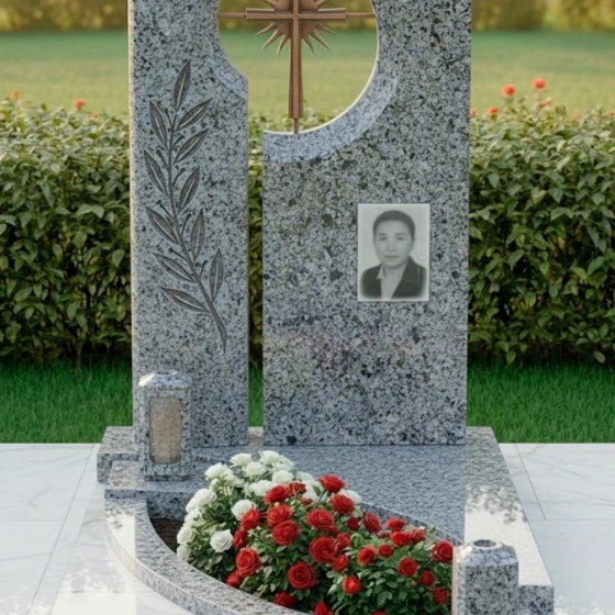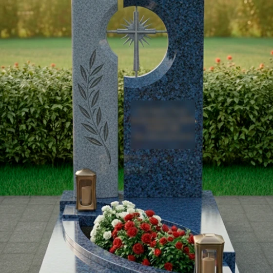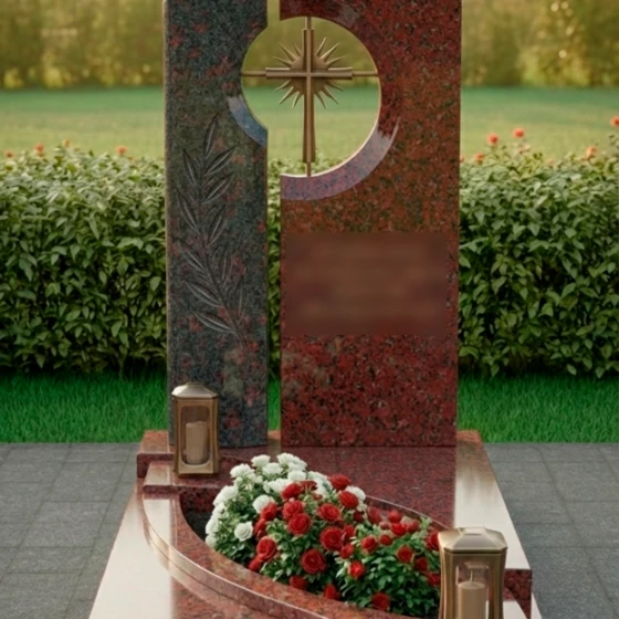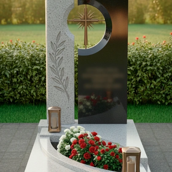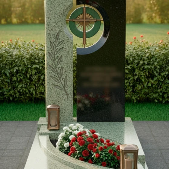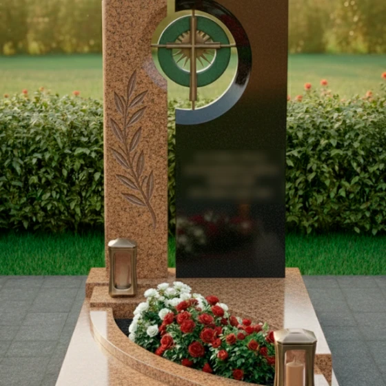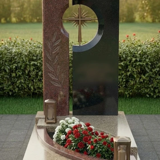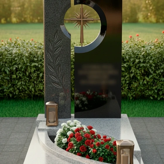 Данный гранитный монумент представляет собой сложное архитектурное решение, в котором каждый изгиб наполнен глубоким символизмом. Художественная концепция строится на противопоставлении и единстве двух начал, воплощенных в сочетании разных сортов камня. Центральным элементом композиции является идеальный круг, образованный двумя асимметричными частями мемориала. Этот круг — древний символ бесконечности и вечного цикла жизни, внутри которого парит изящный лучистый крест. Тонкие металлические лучи, расходящиеся от распятия, создают удивительную игру света и тени: при движении солнца грани креста оживают, наполняя пространство вокруг надгробия мягким сиянием. Левая часть памятника украшена глубокой художественной резьбой в виде оливковой ветви. Каждое перышко листа выполнено с филигранной точностью, создавая объемный матовый узор, который эффектно контрастирует с зеркально отполированной основной поверхностью.