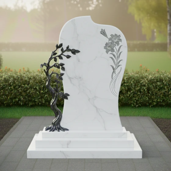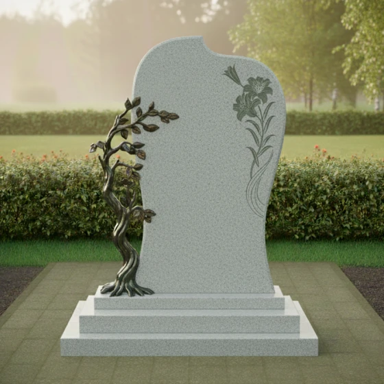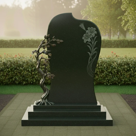 Представленная мемориальная композиция под артикулом 732 — это подлинное произведение искусства, в котором застывшая динамика камня гармонично сочетается с глубоким философским подтекстом. Главным художественным акцентом здесь выступает искусная объемная резьба в виде раскидистого дерева, чьи корни буквально прорастают сквозь основание стелы, символизируя неразрывную связь времен и вечную жизнь души. Ствол дерева выполнен с поразительной детализацией: каждая трещинка «коры» и изгиб ветвей создают эффект живого присутствия, контрастируя с идеально гладкой, зеркальной поверхностью основной части монумента. Плавная асимметричная волна в верхней части обелиска, дополненная изящным вырезом, придает всей конструкции легкость и одухотворенность, превращая массивный монолит в символ светлой грусти и покоя.