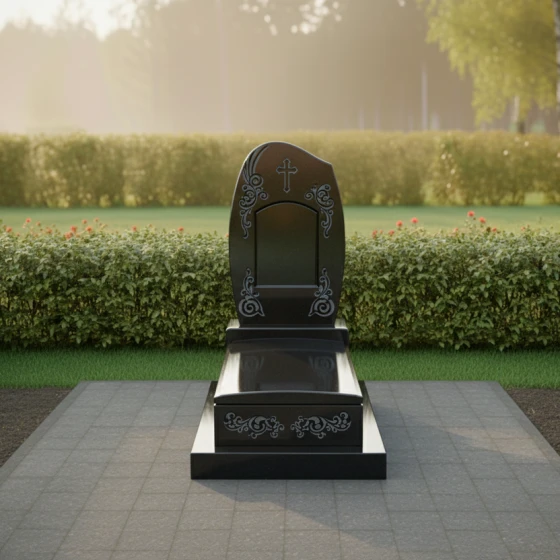 Особое внимание притягивает художественная резьба, обрамляющая пространство для портрета. Изящные растительные орнаменты в виде симметричных завитков создают эффектную рамку, которая словно «раскрывает» стелу навстречу зрителю. Надгробие из натурального камня в этой модели демонстрирует безупречную игру контрастов: идеально черная зеркальная полировка основной плоскости соседствует со светлым матовым срезом камня внутри резных элементов. Это создает глубокий объемный эффект, который меняется в зависимости от угла зрения, заставляя композицию «оживать» при движении света.