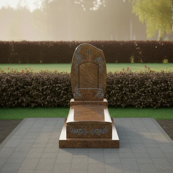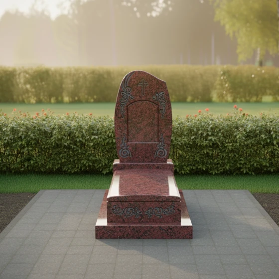 Монументальная композиция под артикулом 738 представляет собой воплощение архитектурного баланса и художественной сдержанности. В основе дизайна лежит плавная асимметрия верхней грани стелы, которая напоминает застывшую в камне волну или изгиб небесного свода. Такая геометрия избавляет мемориал от излишней строгости, привнося в облик участка ощущение покоя и одухотворенности. Центральное место в верхней части занимает лаконичный православный крест, выполненный методом глубокой гравировки. Его чистые линии подчеркивают конфессиональную принадлежность, не перегружая общую эстетику лишними деталями.