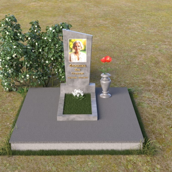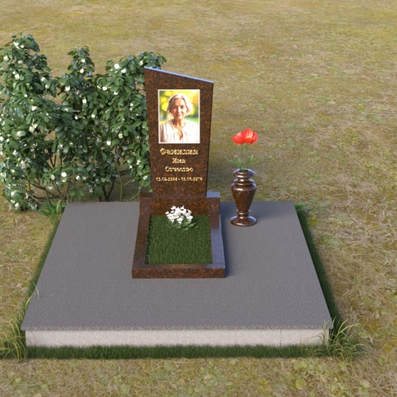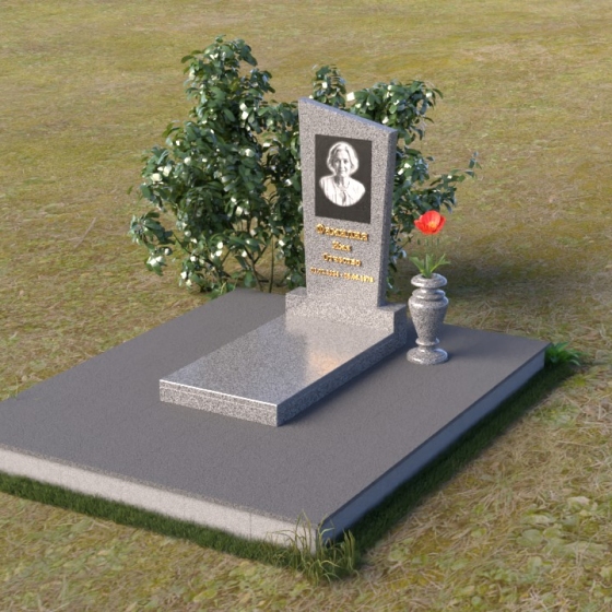 Мемориальная композиция состоит из нескольких элементов, каждый из которых тщательно продуман и выполнен с безупречным качеством. Начинается все с основания – широкой, массивной плиты, которая обеспечивает устойчивость всей конструкции. Её матовая, слегка шероховатая поверхность призвана оттенять блеск полированных элементов, создавая игру фактур и контрастов. Далее взгляд переходит к горизонтальной стеле, расположенной на постаменте. Она выполнена в виде прямоугольника с плавными, скругленными углами, что придает ей мягкость и элегантность. Поверхность стелы отполирована до зеркального блеска, отражая небо и окружающий мир, словно напоминая о связи между земным и небесным. На постаменте возвышается вертикальная стела с портретом и надписью. Верхняя часть стелы имеет скошенный угол, что добавляет динамики и оригинальности всей композиции. На стеле выгравированы имя, фамилия и отчество усопшего, а также даты жизни, выполненные изящным шрифтом. В правом углу композиции расположена ваза, предназначенная для цветов. Её классическая форма и полированная поверхность гармонично дополняют общий стиль мемориала.