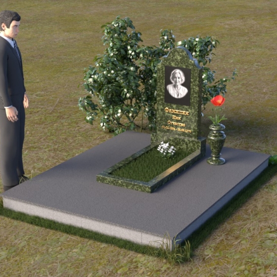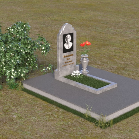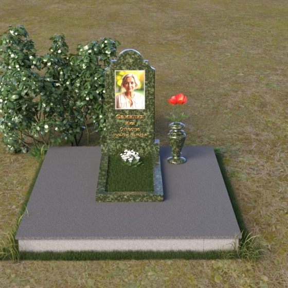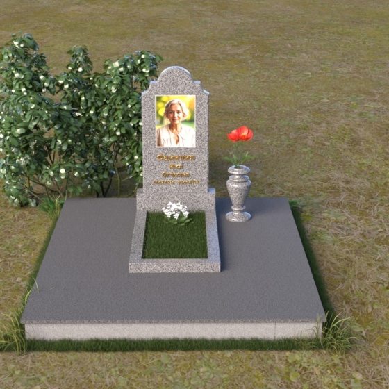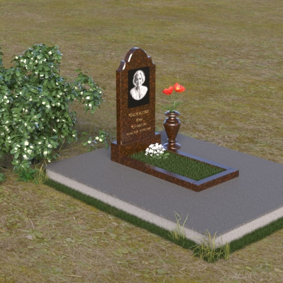 Мемориальная композиция ПВ 067 представляет собой вертикальную стелу, увенчанную плавной, изящной аркой. Верхняя часть стелы имеет аккуратно скругленные углы, что придает ей мягкость и утонченность. В верхней части стелы располагается овальный медальон с портретом. Нижняя часть стелы переходит в горизонтальную плиту, образуя единое целое. Плита имеет строгую прямоугольную форму с четкими гранями. Фаска по периметру плиты придает ей законченный вид и подчеркивает геометрию. Рядом со стелой установлена небольшая ваза из того же материала, выполненная в классическом стиле. Ее плавные линии и темный цвет гармонично сочетаются с основным элементом композиции.