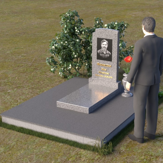 Основание мемориальной композиции – широкая плита, выполненная из камня с матовой фактурой. Ее цвет контрастирует с глянцевой поверхностью стелы и горизонтальной плиты, создавая визуальный интерес и подчеркивая строгость линий. Геометрия модели продумана до мелочей: от основания, надежно покоящегося на земле, до вертикальной стелы, устремленной ввысь. Плавные переходы между элементами композиции создают ощущение гармонии и завершенности.